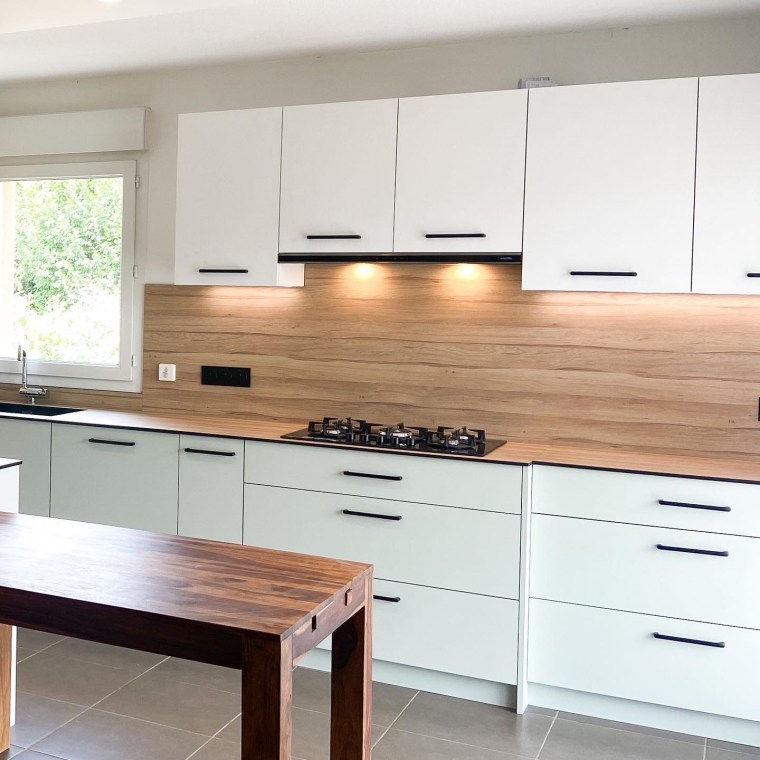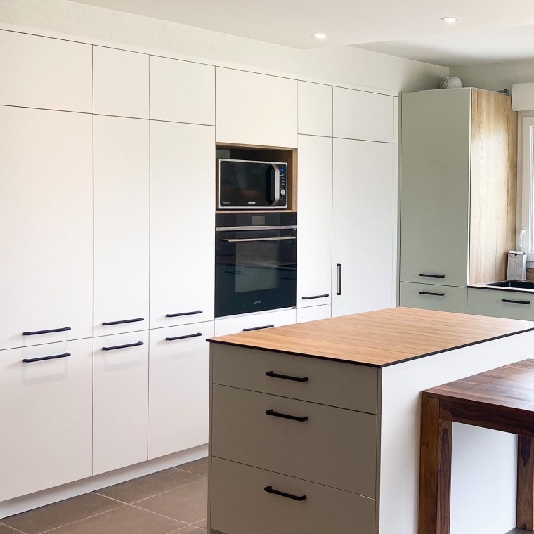 Nous avons privilégié le blanc pou apporter un maximum de lumière à l’espace, sans oublier une touche de couleur avec des façades vert pâle qui s’accordent si bien avec le bois !