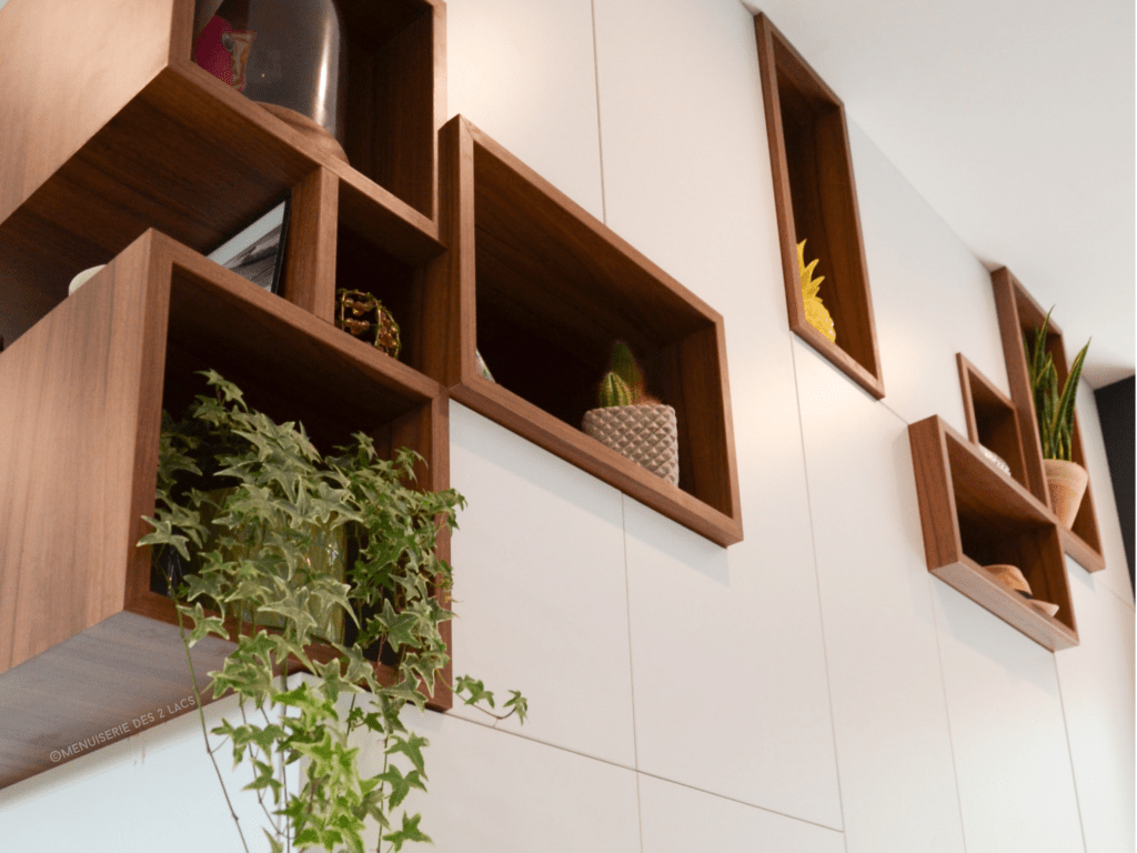 Portes et tiroirs push-lash. Placage blanc alpin et noyer de Bourgogne de chez Egger.